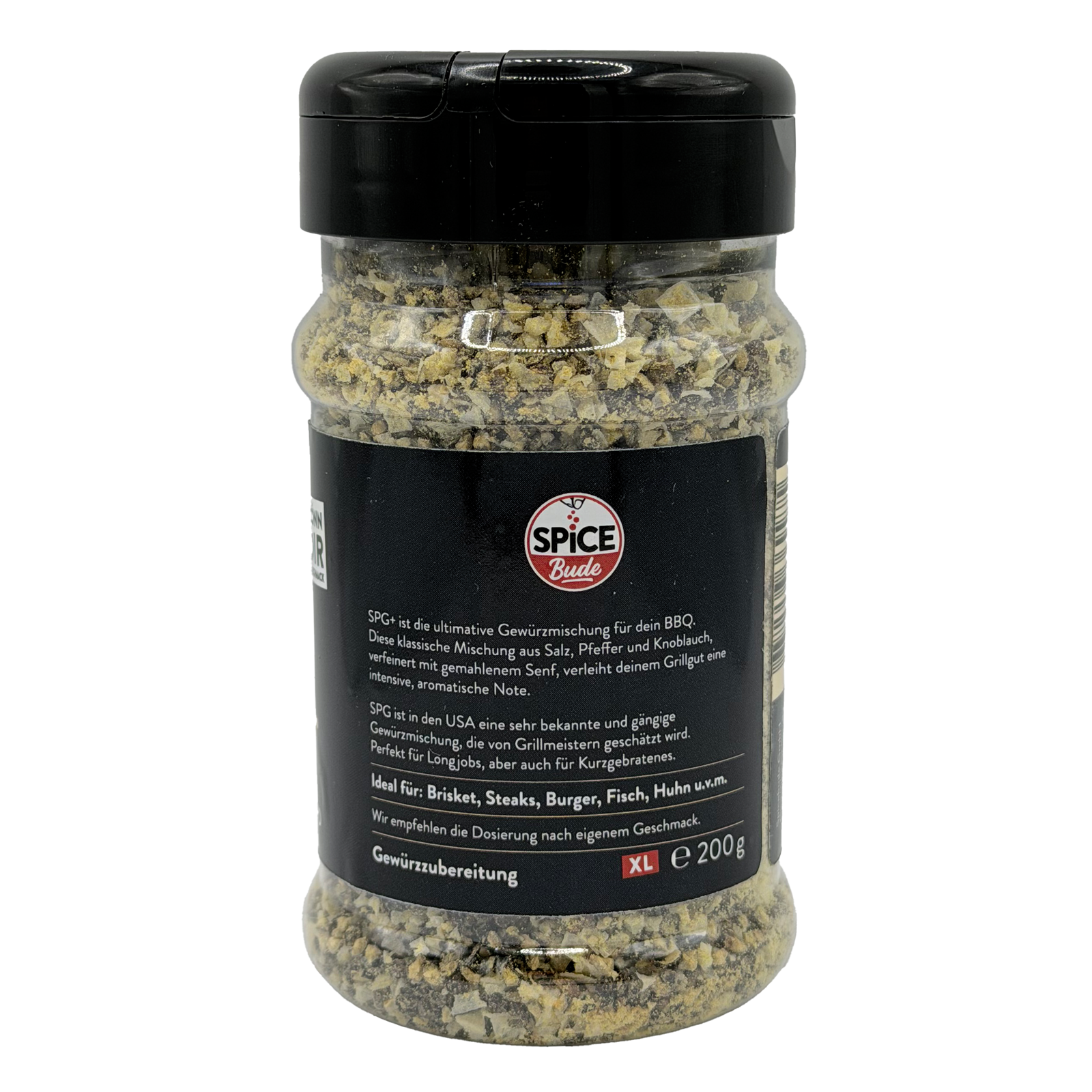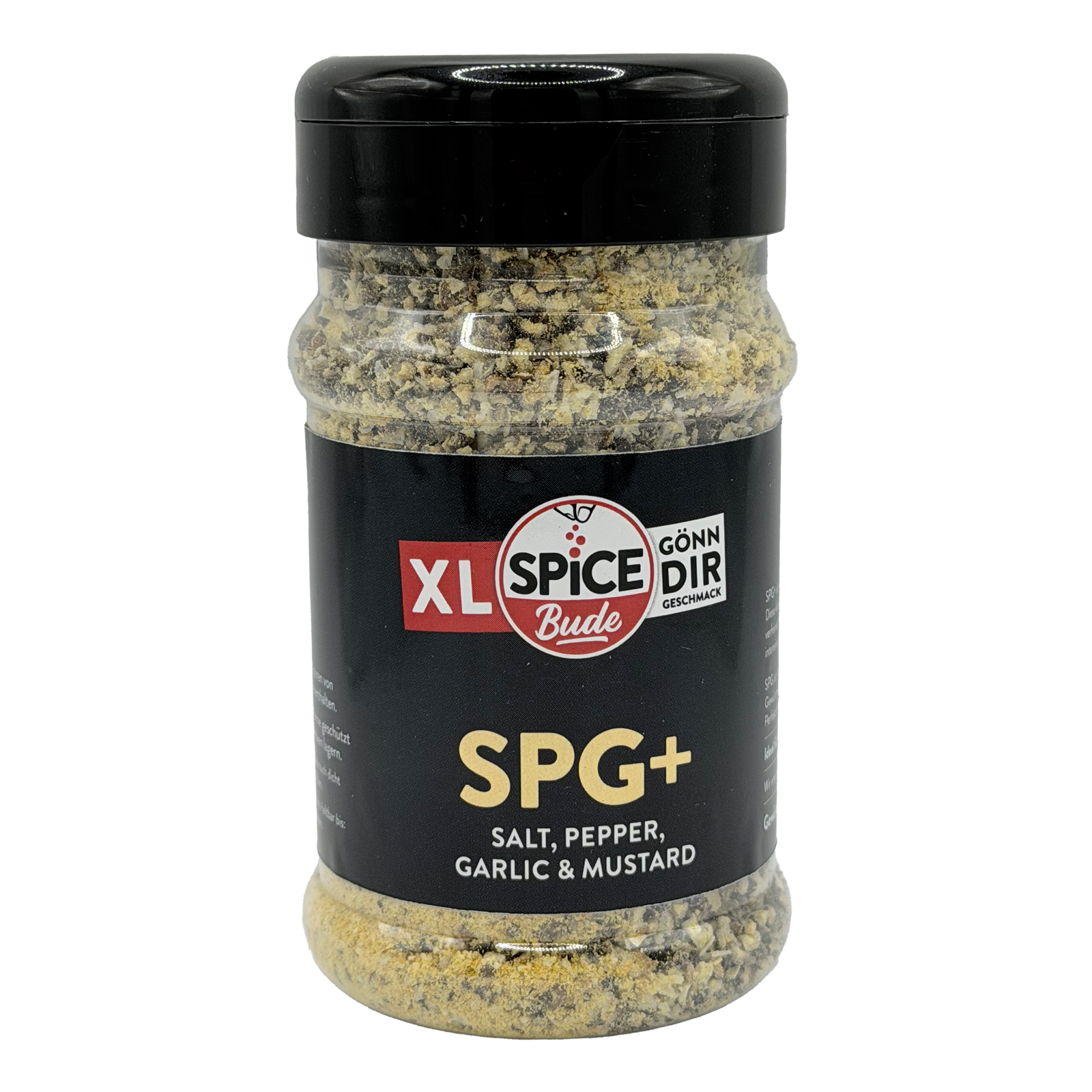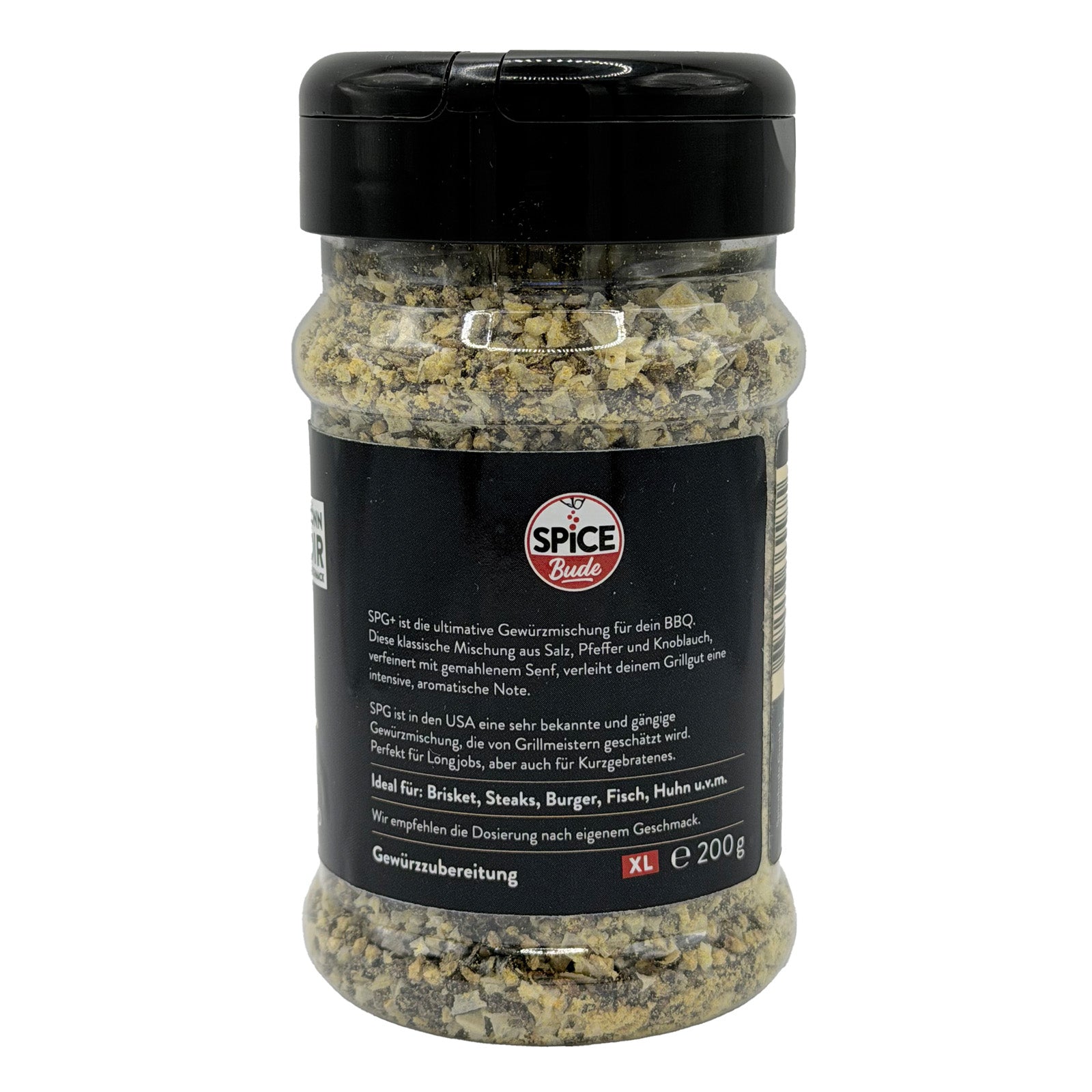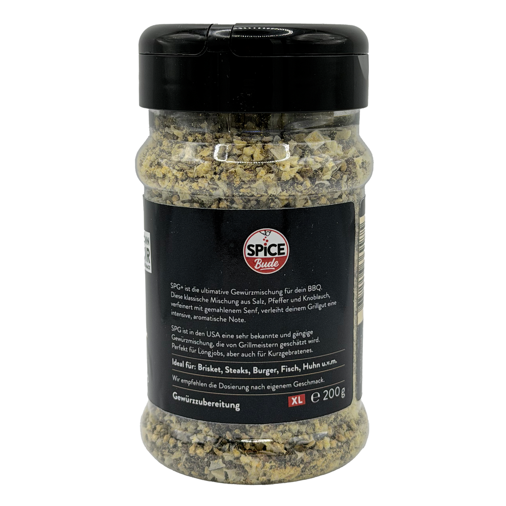 Lerne SPG+im XL Streuer kennen: die aufgepimpte Version des klassischen SPG-Rub, der in der amerikanischen BBQ-Szene Kultstatus hat. Unsere Mischung basiert auf der bewährten Dreierkombination aus Salz, Pfeffer und Knoblauch, bekommt aber durch gemahlenen Senf eine zusätzliche, tiefgehende Geschmacksnote. Das Ergebnis ist ein klarer, herzhaft-würziger Charakter mit mehr Schub im Rücken — genau das, was dein Grillgut nach vorne bringt.